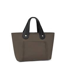 Bolsa capazo pequeño Tous de la colección Shelby de vinilo con efecto piel combinado con nylon reciclado en color caqui. Cierre con cremallera. Asa de bandolera ajustable, extraíble y dos asas de mano. Bolsa cuenta con 1 bolsillo exterior con cremallera, 1 bolsillo exterior plano y 2 bolsillos interiores: 1 plano y 1 con cremallera. Medidas: 34 x 20 x 15cm.