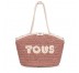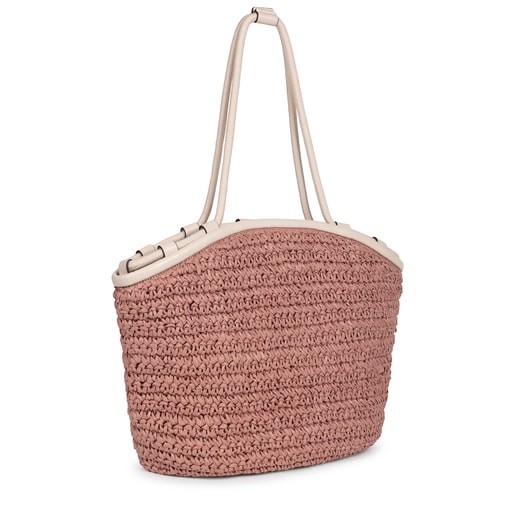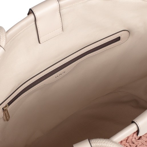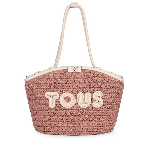 Bolso Capazo Tous de la colección Craft de papel natural trenzado en color rosa y beige con elementos de poliuretano efecto piel y la parte interior de algodón. Cierre con boton magnetico, asas de hombro. Capazo cuenta con un bolsillo interior con cremallera. Medidas: 46 x 30 x 15, 5 cm.