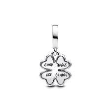 Elegante símbolo de la suerte con este charm giratorio de un trébol de cuatro hojas. Creado en plata de primera ley con recubrimiento de oro de 14k se ha embellecido con un brillante diamante creado en laboratorio de 0,007 quilates en el centro. El trébol delantero gira, revelando el mensaje grabado: "GOOD THINGS ARE COMING" (Lo bueno está por venir, en español).