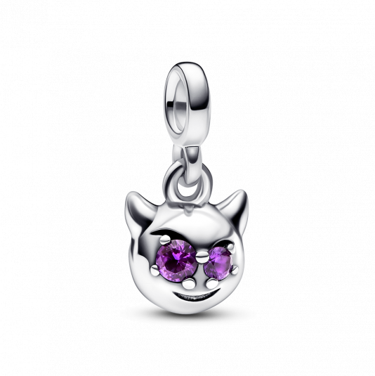 mini colgante se presenta con dos cristales sintéticos de color morado con talla brillante en los ojos, mientras que su característica actitud descarada remata la expresión facial. La parte trasera del colgante se ha decorado con esmalte en la cola y los característicos cuernos del diablo, que aportan un toque divertido.