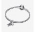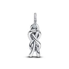 Charm Colgante Nudo Infinito Pavé. Acabado a mano en plata de ley, este charm se centra en un símbolo de nudo infinito y un disco colgante con la inscripción "Amor Infinito". Las piedras brillantes añaden textura tanto al frente del charm como al asa.