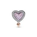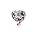 harm Pandora para mujer de la colección Día de la Madre 2023 fabricado en plata de primera ley y con un recubrimiento electrolítico en oro rosa de 14k Mamá & Corazón en Filigrana en Dos Tonos adornado con circonitas cúbicas transparentes de talla brillante, una circonita cúbica rosa de cuento de hadas facetada en forma de corazón engastada en bisel y un cabujón en forma de corazón