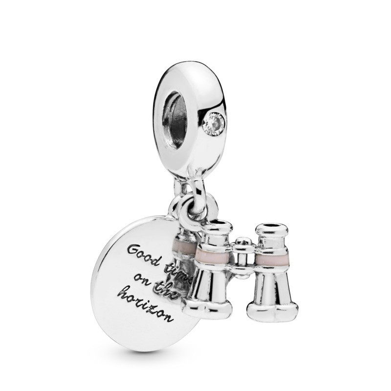 Charm colgante Pandora Prismáticos en plata de primera ley, adornado con circonitas cúbicas transparentes, esmalte rosa y grabado “Good times on the horizon”.