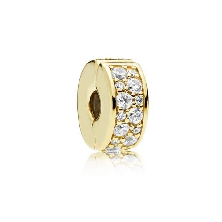 Elegancia brillante, clip hecho en plata de ley PANDORA Shine con baño de oro de 18 quilates y adornado con circonitas cúbicas transparentes y agarre de silicona. R