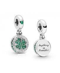 Charm colgante Trébol Brillante en plata de ley con cristales adornado con circonitas verdes y transparentes, y con grabado "Anything is possible". Escribe tu propio destino con este charm de trébol, uno de los símbolos más inspiradores relacionados con la suerte y la buena fortuna.
