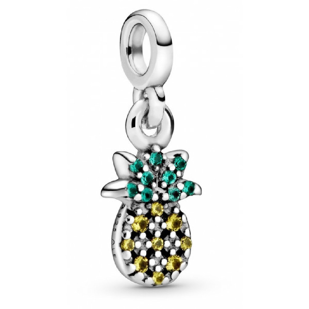 Charm Colgante Mi Piña. con cristales de color verde real, amarillo claro y amarillo brillante. El reverso se presenta con detalles de esferas en plata de primera ley.
