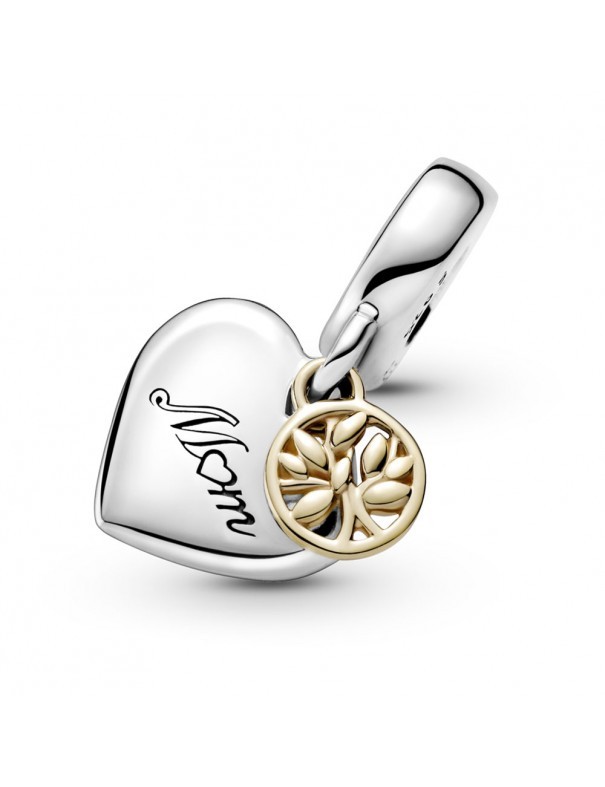 Charm Colgante Pandora Corazón Árbol De La Familia 799366C00, enplata de primera ley 925mls y Pandora Shine, aleación de metales con recubrimiento en oro de primera ley 18kts. Decorado con grabación "Mom" "You are the heart of our family".