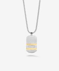 collares con una expresión de estilo diferencial diseñada para hombres inconformistas. La cadena fina de acero sostiene una placa única con detalles bicolor y sutiles incrustaciones de cristales, añadiendo un atractivo toque punk. Fabricado completamente en acero, este collar se convierte en un símbolo de individualidad, capturando la esencia del hombre que busca destacar sin conformarse con lo convencional.