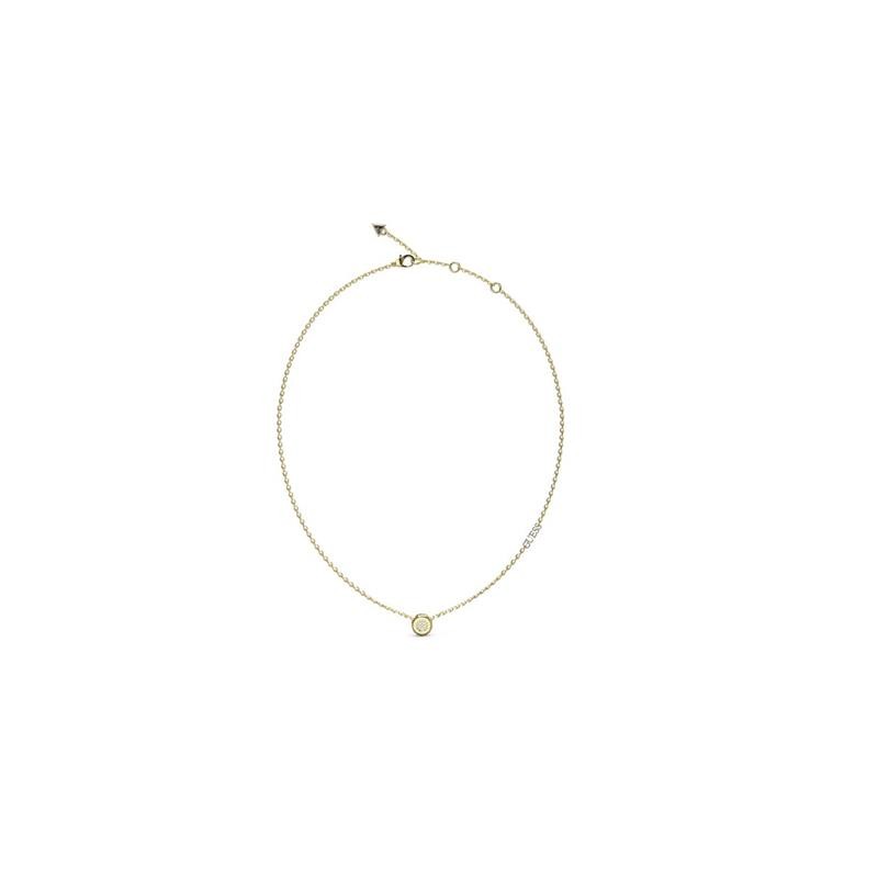 Gargantilla Guess para mujer de la colección Stylish fabricada en acero inoxidable bañado en oro amarillo compuesta por una fina y elegante cadena que contiene la palabra "GUESS" y que contiene un colgante circular compuesto por cristales blancos. Su cierre es de mosquetón ajustable mediante cadena extensible.