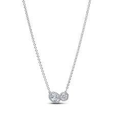 Collar Halo. Este collar en plata de primera ley se presenta con dos gemas brillantes, una redonda y otra ovalada, conectadas por un halo de pavé. Una tercera gema cuelga cerca del cierre del collar. La cadena del collar se puede ajustar en dos longitudes distintas.