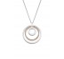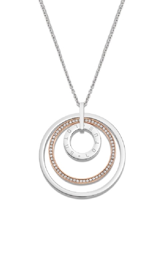 Collar Lotus Style para mujer en acero inoxidable. Este original collar está compuesto por una fina cadena y un colgante compuesto de 3 círculos cada uno en el interior del otro. El circulo exterior es plateado, el siguiente bañado en oro rosa con circonitas alrededor y el círculo interior plateado con el nombre de la marca grabado.