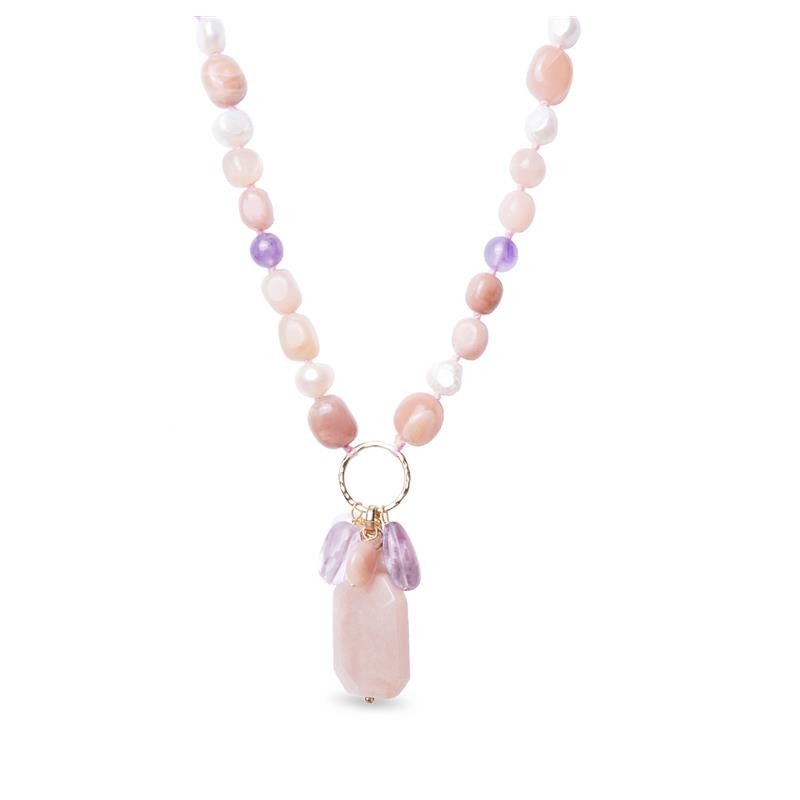 Collar de Luxenter Metal que combina amatista natural, perla blanca y piedra del sol. La parte superior (la que rodea el cuello) es de metal dorado para que llevarlo sea aún más cómodo. Todo el poder de las piedras naturales en un diseño que enamora.