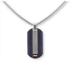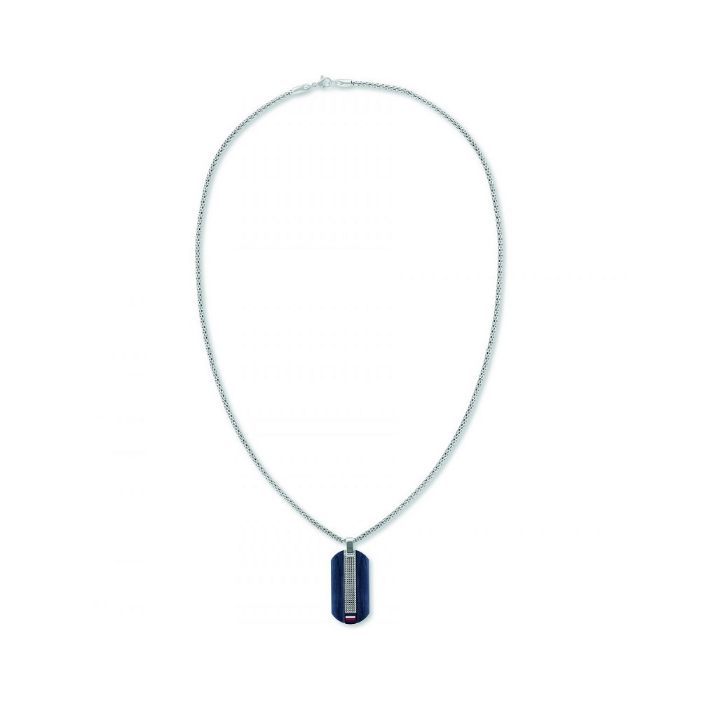 Collar Tommy Hilfiger para hombre 2790317 realizado en acero inoxidable con colgante con forma de chapa de 20 x 39 cm. con acabado ip azul decorado con el detalle de la marca. La medida es de 60 cm con cierre de mosquetón.