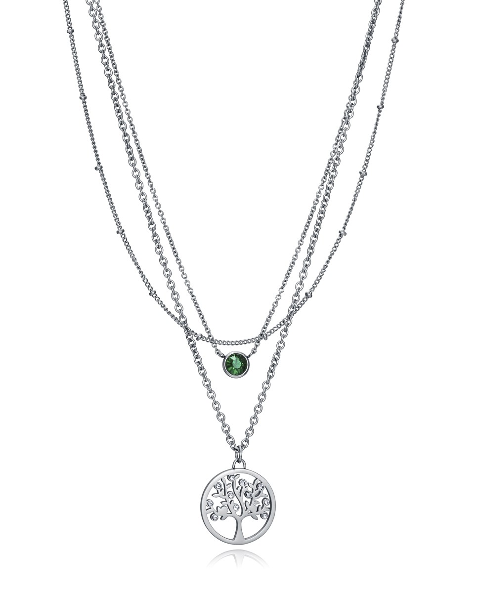 Collar múltiple Viceroy Kiss de tres cadenas en acero con circonita verde y árbol de la vida con circonitas blancas. Largos de las cadenas, 34cm, 36cm, 42cm y 3cm de extensión
