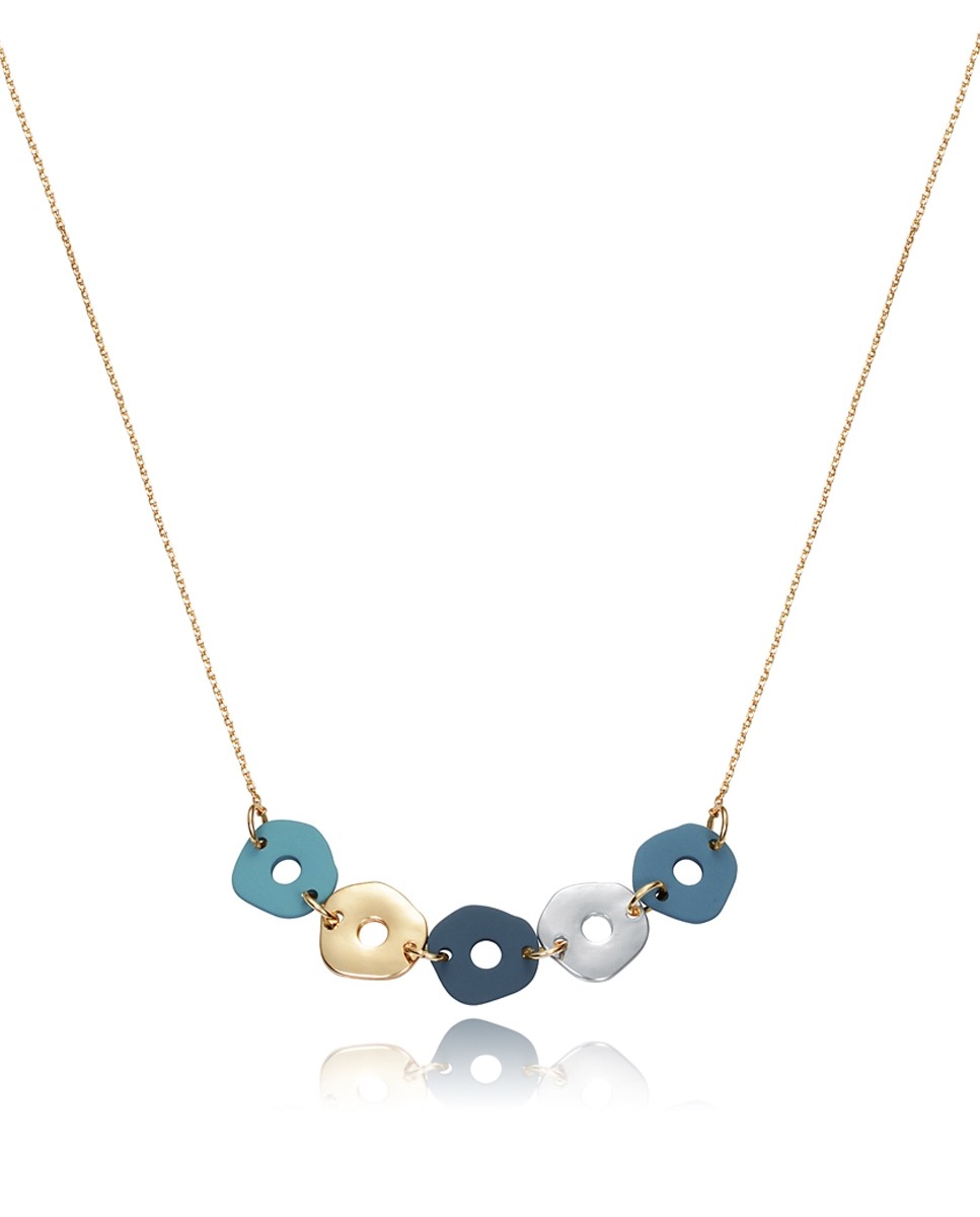 Collar Viceroy Air de metal dorado con 5 discos irregulares en colores turquesas, dorado y plateado. Largo de 42cm y 3 cm extensión.
