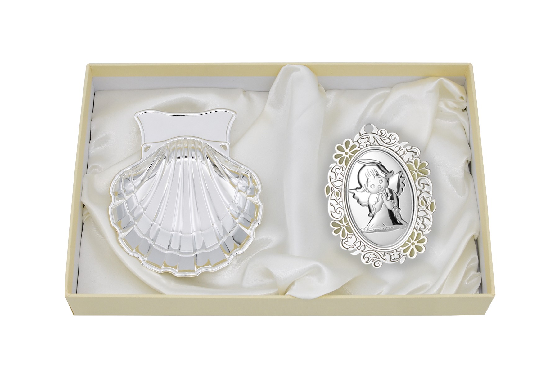 ESTUCHE CONCHA METAL PLATEADO Y MEDALLON CUNA GA1155