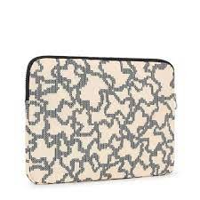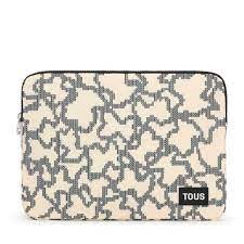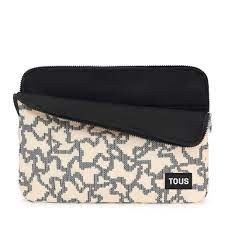 Funda para portátil TOUS Kaos Pix Soft de poliéster reciclado con estampado en color beige y negro. Cierre de cremallera y bolsillo interior abierto. Medidas (alto x ancho x fondo): 24,5 x 34 x 2 cm.