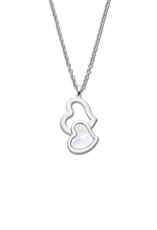 Es un collar original de la marca Lotus Style, con materiales de alta calidad, para mujer. Está fabricado en acero antialérgico e inoxidable, decorado con un colgante en forma de doble corazón unido, uno de ello decorado con nacar blanco.