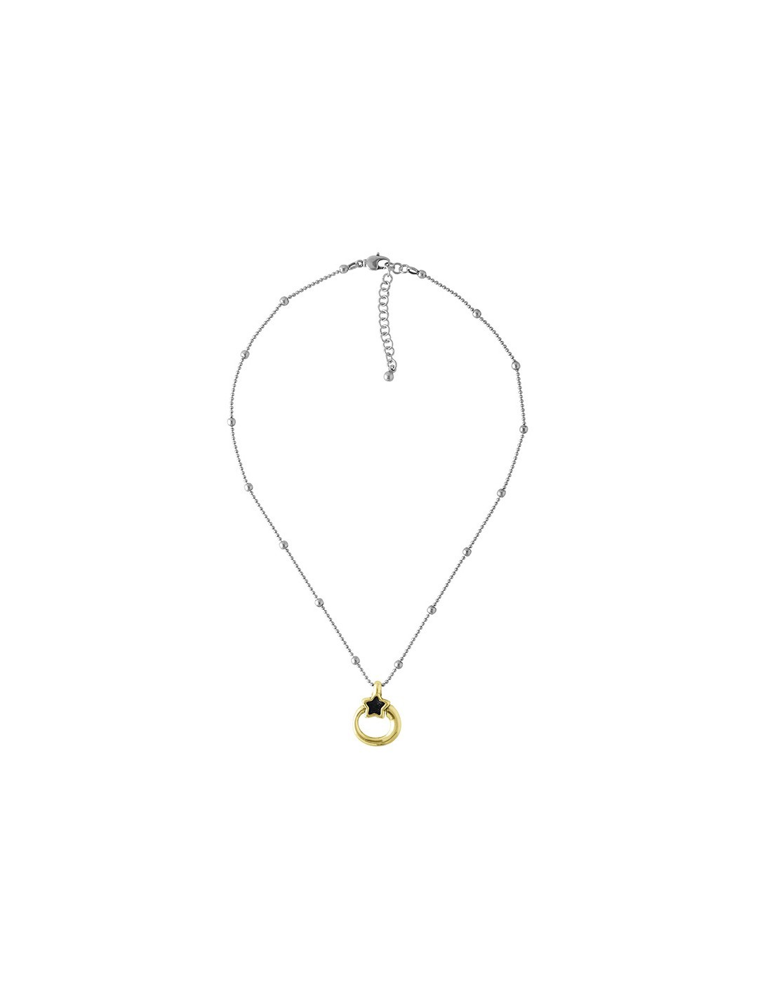 Collar Lucero Oro con estrella y estela de aro con movimiento bañado en oro de la Colección Estela. Diseño de estrella decorada con cristal Murano disponible en 4 colores. La cadena es de cordoncillo y bolitas de metal bañado en plata. Mide de 44 a 50 cm. Cierre de mosquetón.