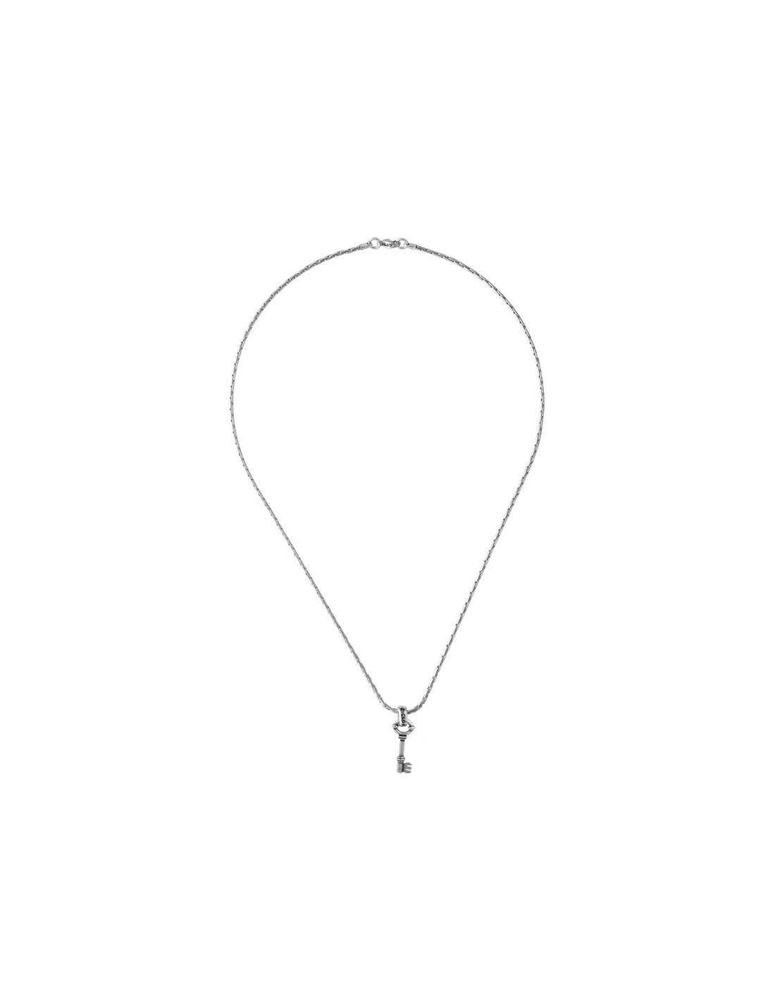 Collar Llave de la colección especial para hombre de la firma Ciclón. Colgante con diseño de llave vintage de 25 mm bañada en plata. La cadena es de cordón de acero inoxidable y mide 50cm. Cierre de mosquetón.