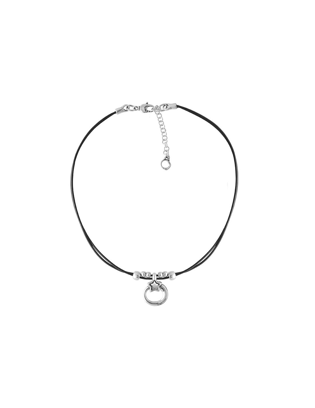 Collar corto Cometa con cuero de la Colección Estela. Colgante con diseño de estrella y estela de aro con movimiento bañado en plata de la Colección Estela. Estrella decorada con cristal Murano disponible en 7 colores. El colgante mide 25 mm y el collar de 42 a 47 cm. Cierre de mosquetón.