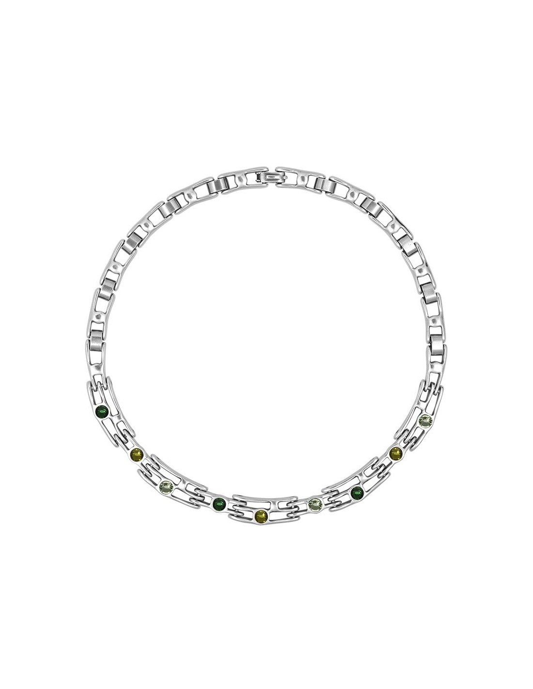 Collar Hanae bañado en plata de la Colección Saori inspirada en la filosofía Feng Shui. Diseño original Ciclón de eslabones articulados decorados con cristales facetados. Disponible en 4 combinaciones de color. Mide 45 cm. Cierre de pico de pato.