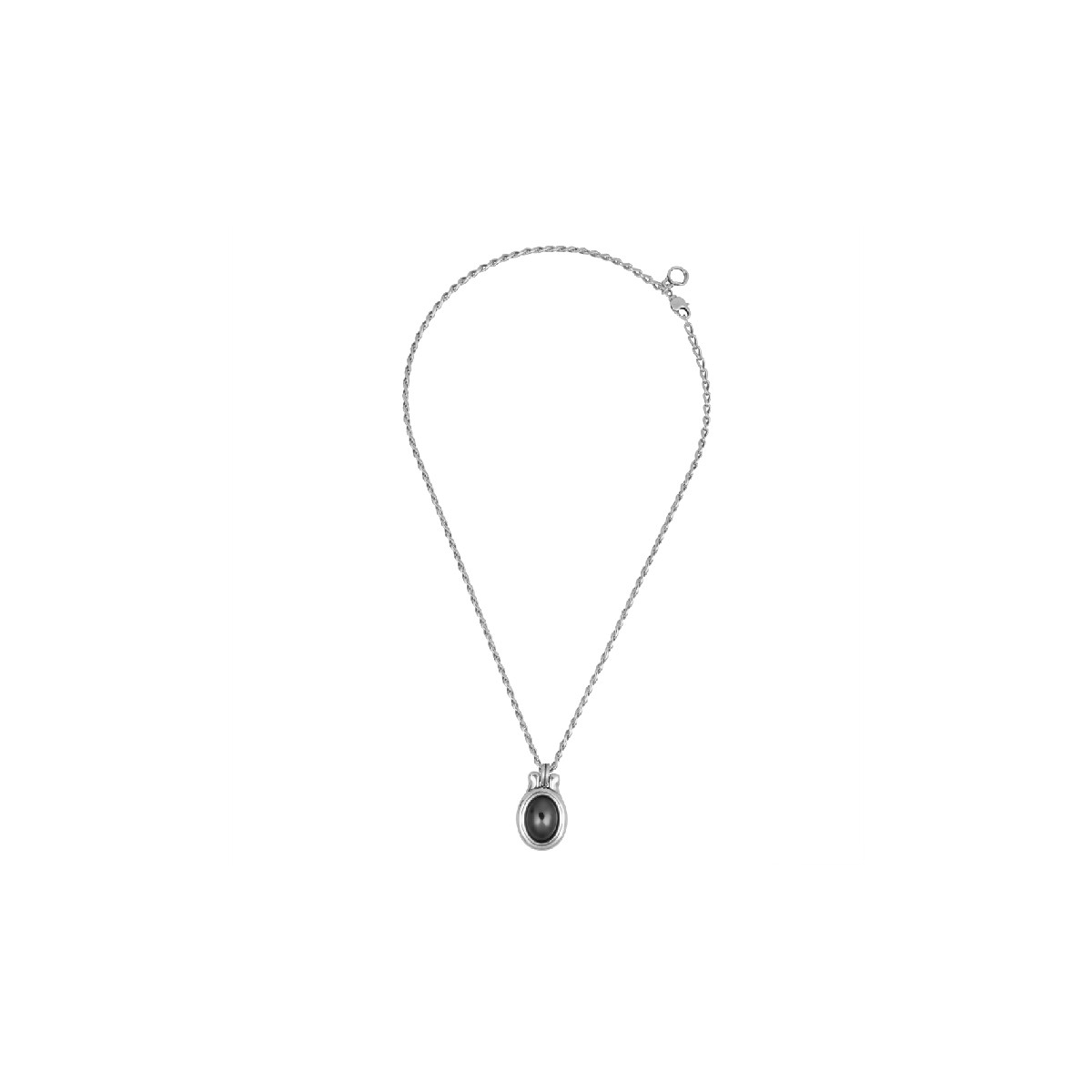 Collar Ventura largo bañado en plata con piedra en color hematite. La cadena mide 47cm pudiendo ampliarse 4cm. Cierre de mosquetón.