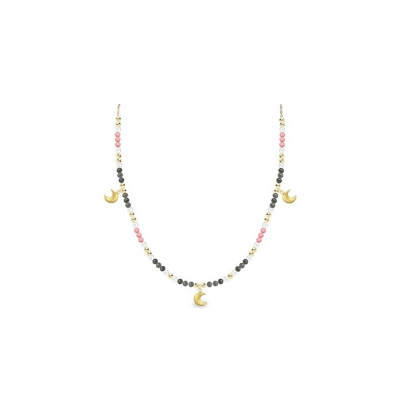 Collar de plata de ley 925 chapada en oro amarillo con bolitas de labradorita, cuarzo fumé y perlas naturales. Colgantes de lunas doradas.