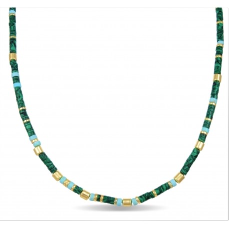 Collar de plata de ley 925 chapada en oro amarillo con cilindros de plata y malaquita.