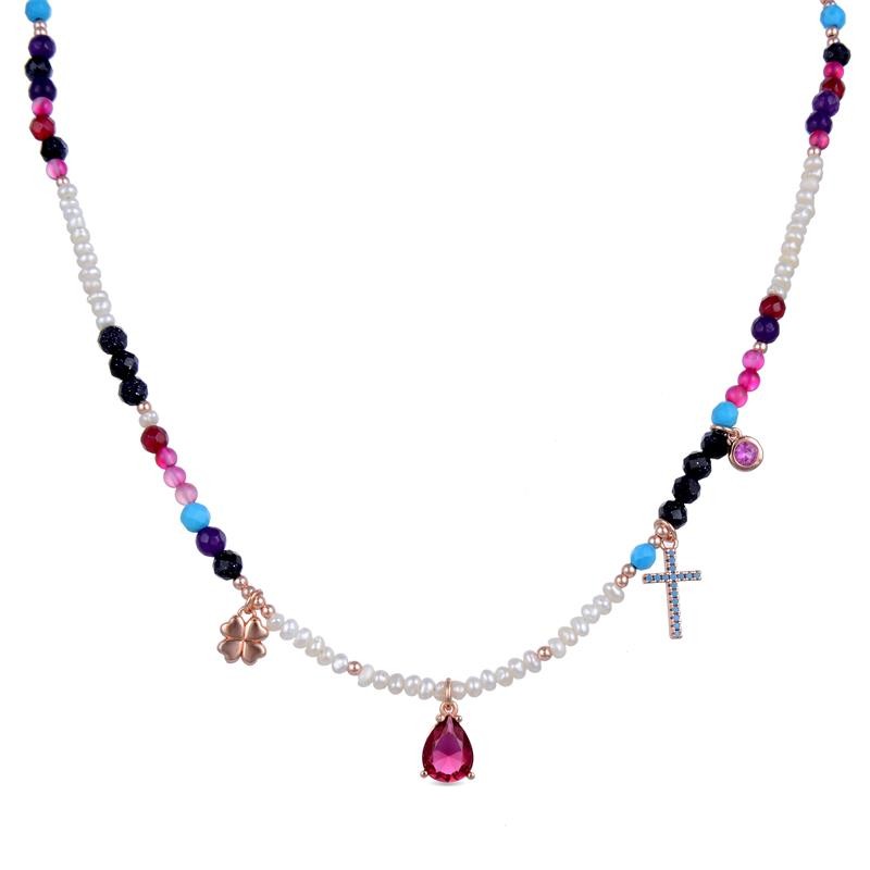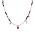 Gargantilla Luxenter para mujer modelo Miya fabricada en plata de primera ley con piedras multicolor que forman su cadena, cuenta con 4 colgantes, uno de ellos en forma de trébol, otro en forma de cruz, una circonita fucsia en bisel y un colgante central en forma de lágrima con una circonita morada engastada. Su cierre es de mosquetón.