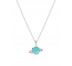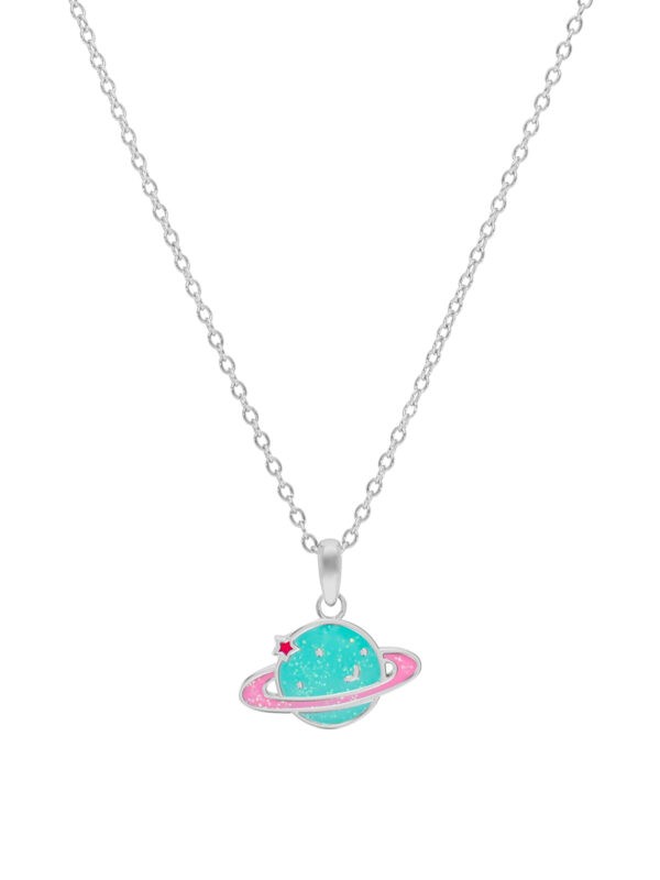 Collar planeta. Plata de 1ª Ley rodiada. Esmalte turquesa y rosa. Detalles con purpurina. Cierre rehasa. Cadena adaptable. Material: Plata de 1ª Ley 925 mil.