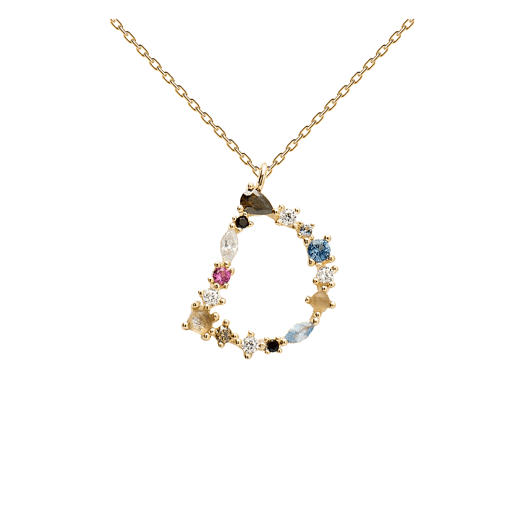 Collar PdPaola para mujer fabricado en plata con baño de oro formado por una fina cadenita bañada en oro que da lugar a un colgante de la Inical Letra D formada por piedras engastadas manualmente. Un collar atractivo que te dotará de elegancia colorido y personalidad gracias a su inicial.