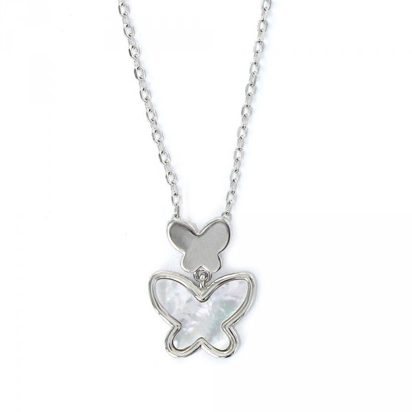 Colgante De Plata Rodiada Con Cadena Mariposa Lisa De 7 Mm Y Nacar De 14 Mm