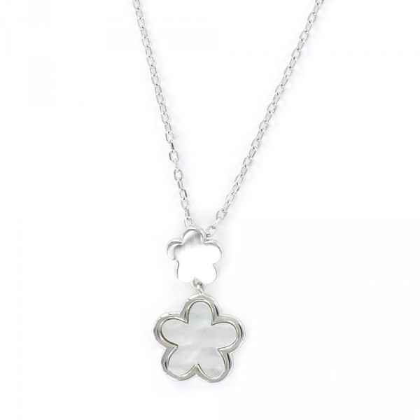 Colgante De Plata Rodiada Con Cadena Forzada Flor Lisa De 7 Mm Y Nacar De 14 Mm