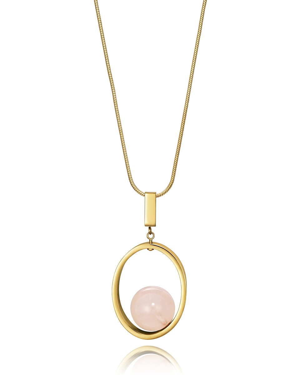 Colgante Viceroy Air de acero IP dorado (44mm largo total) con diseño de pieza rectangular y aro grueso (8mm ancho) con piedra de cuarzo rosa en el interior (de 1,5cm). Cadena tipo serpiente rendonda de 55cm de largo y 5 cm extensión