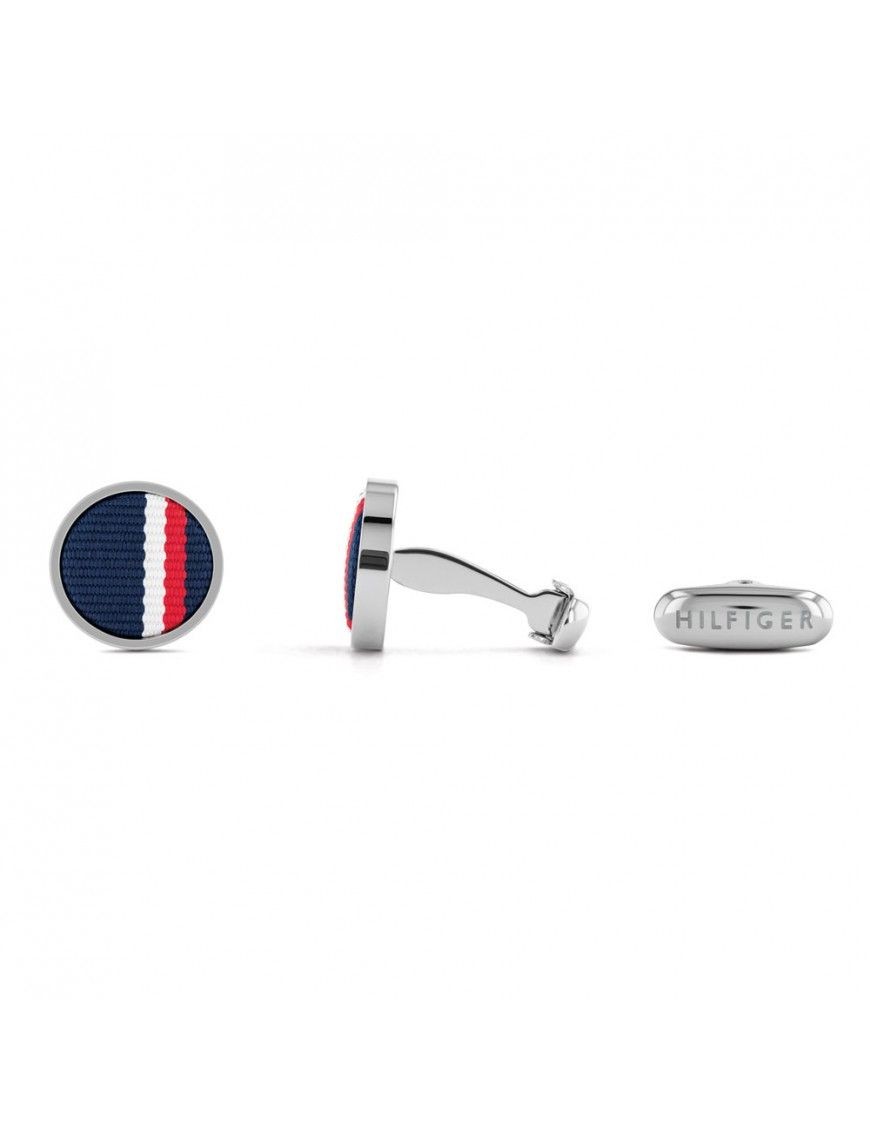 Gemelos Tommy Hilfiger Hombre 2790352, en acero con forma circular y detalle de tela azul con logo de la marca.52
