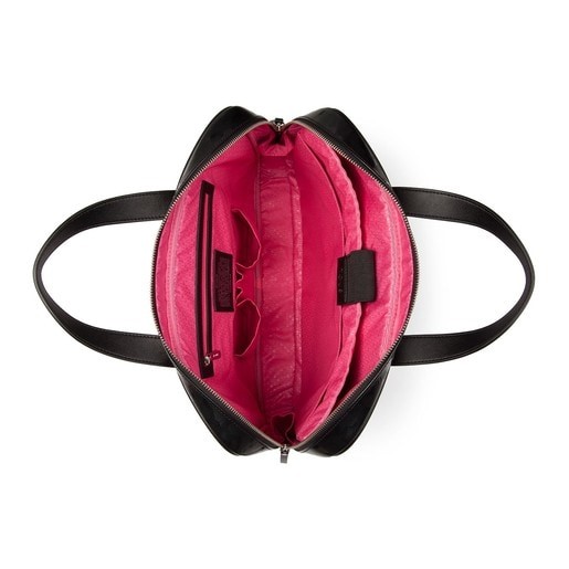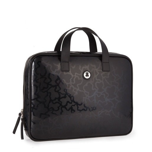 Maletín TOUS Kaos Shiny modelo 328 en vinilo hidrófugo color negro. Cierre con cremallera. Cinco departamentos interiores para varios (uno con cremallera) y dos para bolígrafos. Con forro, asa corta y bandolera. Medidas: 29x38x3 cm.