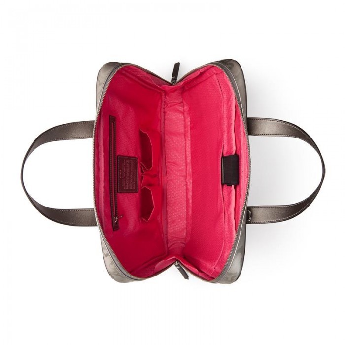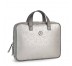 Maletín TOUS Kaos Shiny modelo 328 en vinilo hidrófugo color plata. Cierre con cremallera. Cinco departamentos interiores para varios (uno con cremallera) y dos para bolígrafos. Con forro, asa corta y bandolera. Medidas: 29x38x3 cm.