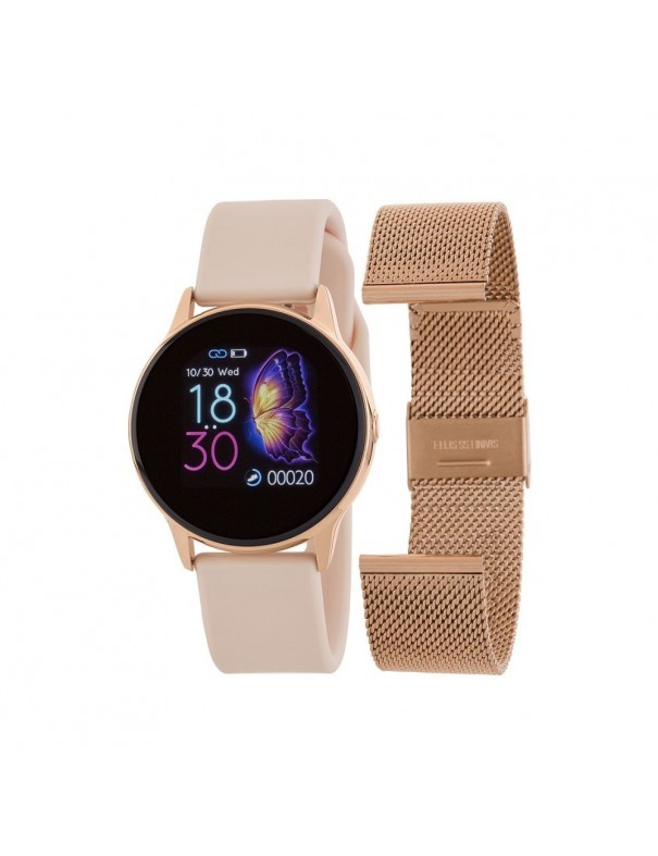 Estuche Reloj Marea Unisex pulsera actividad B58001/4. Es un reloj original de la marca Marea rosado con dos correas una de caucho y otra de malla milanesa oro rosa. Reloj inteligente con pantalla táctil de alta resolución. Uno de los modelos más completos en funcionalidades de Marea. Con el podrás disfrutar de tu actividad física sin prescindir de toda la tecnología de un autentico Smatwatch, entre sus funciones tenemos: Alarma, Envío 24 horas, Bluetooth, Calendario, Calorías, Cronógrafo, Cuenta pasos, Doble correa, Encuentra tu teléfono, Hora mundial, Indicador de carga, Información de salud, Luz trasera, Monitor del sueño, Notificaciones, Pronóstico del tiempo, Recordatorios, SmartWatch, Running, Táctil, Temporizador regresivo. Está clasificado con resistencia al agua IP68, por lo que no le entrará líquido sumergido a un metro y medio durante media hora.