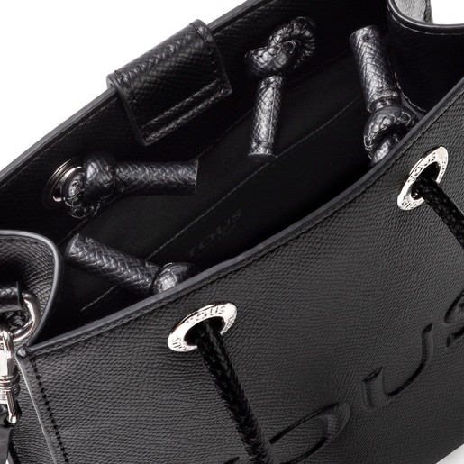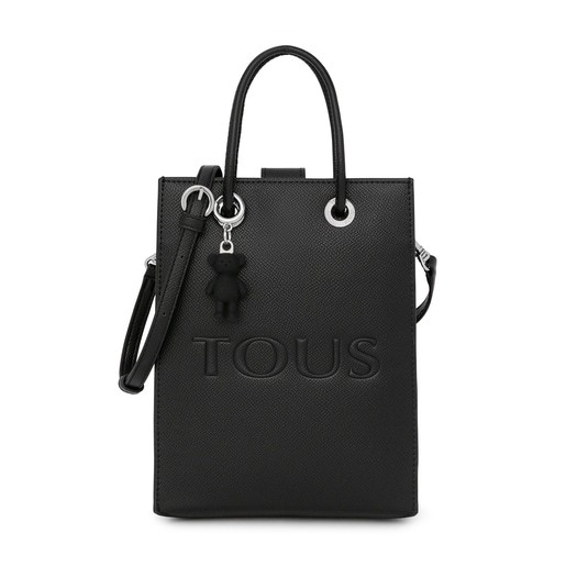 Minibolso bandolera TOUS de la colección Pop, de poliuretano con acabado saffiano, relieve TOUS, en negro. Cierre con botón magnético. Asa de bandolera desmontable y ajustable, asas de mano. Bolsillo interior plano. El bolso cuenta con un detalle de oso colgante. Medidas: 20 x 16 x 6 cm.