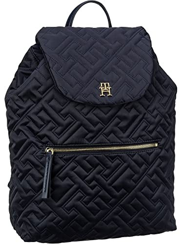 Esta mochila luce un llamativo diseño integral de monogramas TH acolchados y una insignia brillante en la parte delantera.