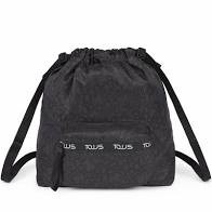 Mochila plana TOUS colección Kaos Mini Sport de nylon con estampado en tono negro-gris. Apliques personalizados en negro. Cierre de frunce. Bolsillo interior con cremallera. Bolsillo exterior con cremallera. Medidas: 40x42x13 cm.
