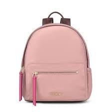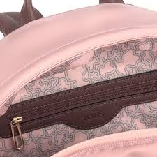 MochilaTous de la colección Shelby de vinilo con efecto piel combinado con nylon reciclado en color rosa. Cierre con cremallera, asas largas de hombro y asa corta de mano. Mochila cuenta con 1 bolsillo exterior con cremallera, 2 bolsillos exteriores planos y 3 bolsillos interiores: 2 planos y 1 con cremallera. Medidas: 25 x 33 x 13cm.