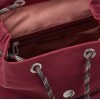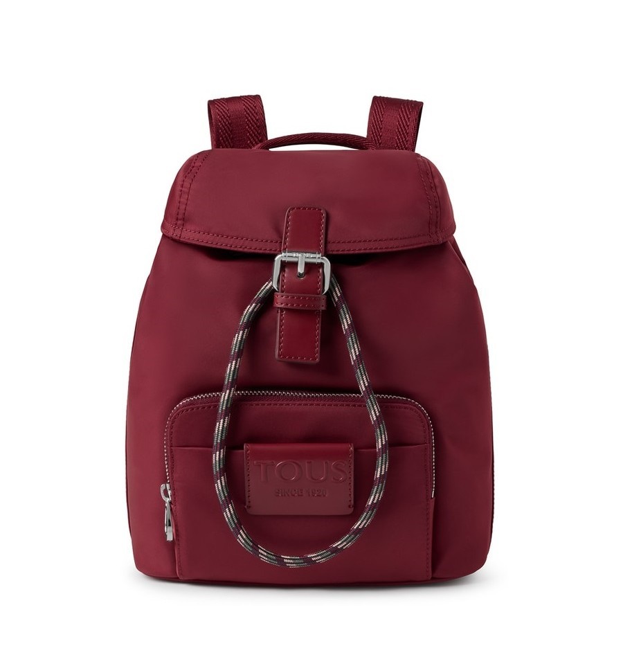 Mochila TOUS para mujer de la colección Empire Soft Chain fabricada en nylon reciclado color burdeos en tamaño pequeño. Se trata de una original y atractiva mochila con cierre exterior de solapa mediante cordón de tela, asa de mano y asas de hombro ajustables. También posee 2 bolsillos con cierre de cremallera uno en su exterior y otro en el interior.