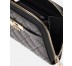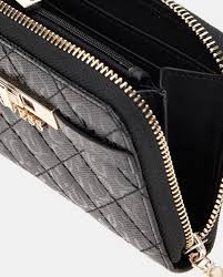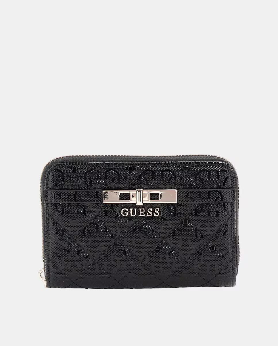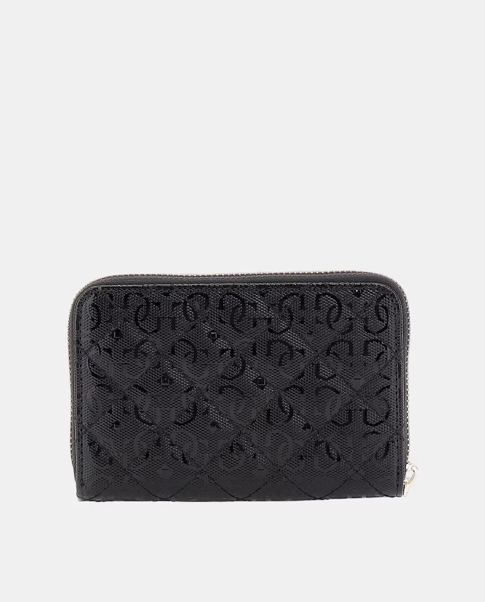 Cartera mediana modelo Idra con terminacion charol acolchado y estampado 4g, piezas metálicas color dorado pálido con logotipo triángulo central, monedero interior con cremallera y divisiones para tarjeta de crédito