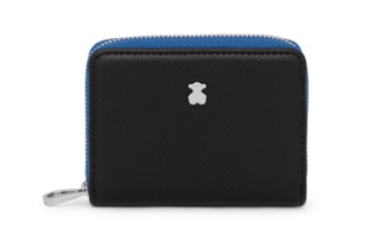 Monedero mediano TOUS de la colección New Dubai de poliuretano con efecto saffiano en color negro y azul. Cierre con cremallera y dos compartimentos para monedas. Medidas: 11 x 8 x 3 cm.