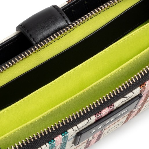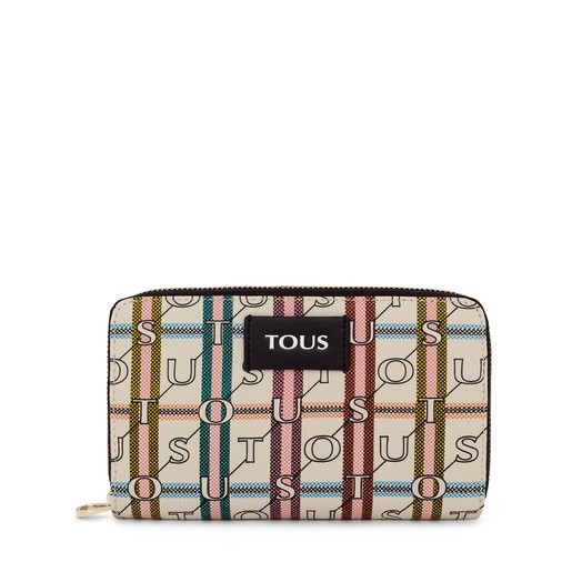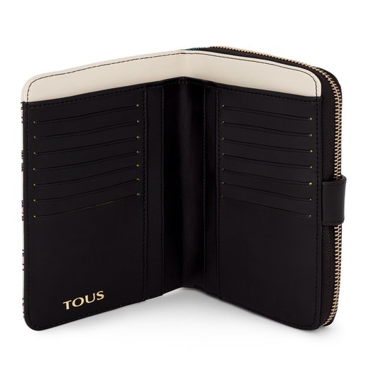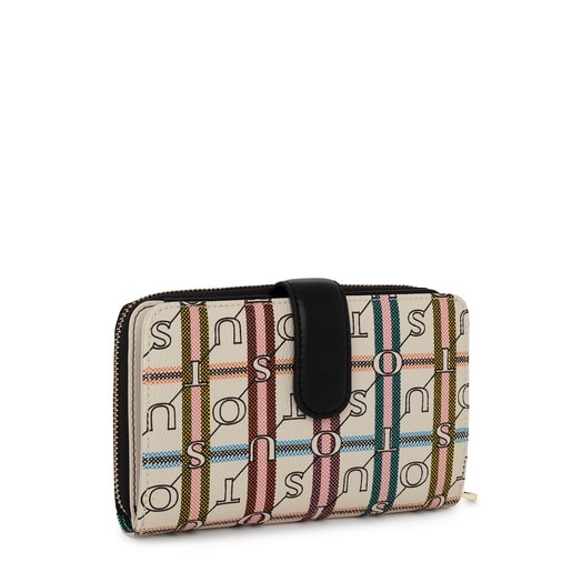 Billetera mediana TOUS Crossroad beige y negra de lona hidrófuga con print monograma y detalles en piel sintética Dispone de dos compartimentos principales. El primero es con cierre de cremallera y cuenta con 3 departamentos abiertos para monedas y 2 ranuras laterales para tarjetas. El segundo es con cierre de botón a presión y cuenta con 14 ranuras para tarjetas, 4 bolsillos y 1 departamento abierto para billetes. Medidas (alto x ancho x fondo): 12 x 19 x 3,5 cm.