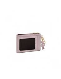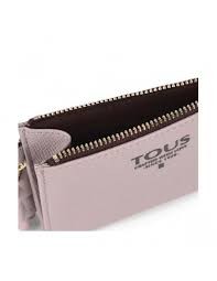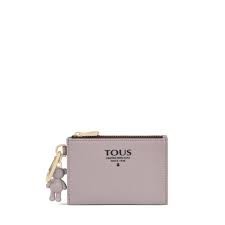 Monedero targetero Tous de la colección Pop de piel sintética con acabado safiano en malva. Cierre con cremallera, 3 compartimentos planos exteriores. Targetero cuenta con un mosqueton y colgante oso. Medidas: 2 x 8 x 12 cm.