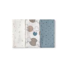 Pack de 3 muselinas Tous Baby de suave algodón fino transpirable anti alergénica multi estampadas con osos, estrellitas, corazones y circulos. Ideal para el cuidado del bebé y para diversos usos. Medidas: 38x38 cm.
