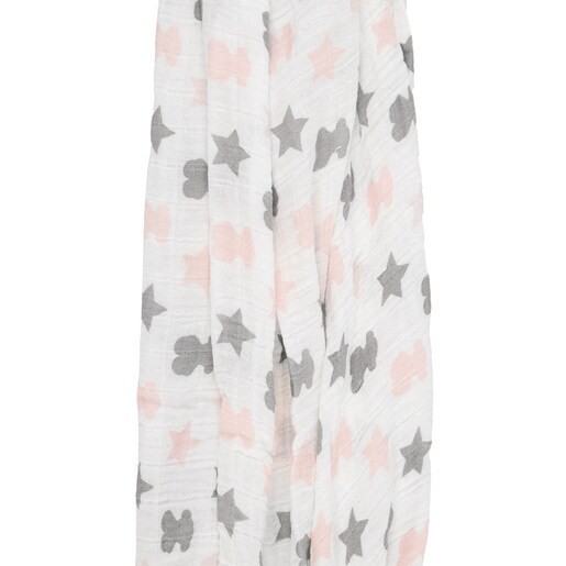 Muselina Baby TOUS con bolsa de tela fina transpirable anti alergénica con estampado osos y estrellas. Se utiliza para arrullar al bebé o protegerlo de los rayos del sol en el cochecito. COMPOSICIÓN: 100% Algodón de color Rosa. MED:118x98cm. Certificado OEKO/TEX*. Fabricado en la EU.